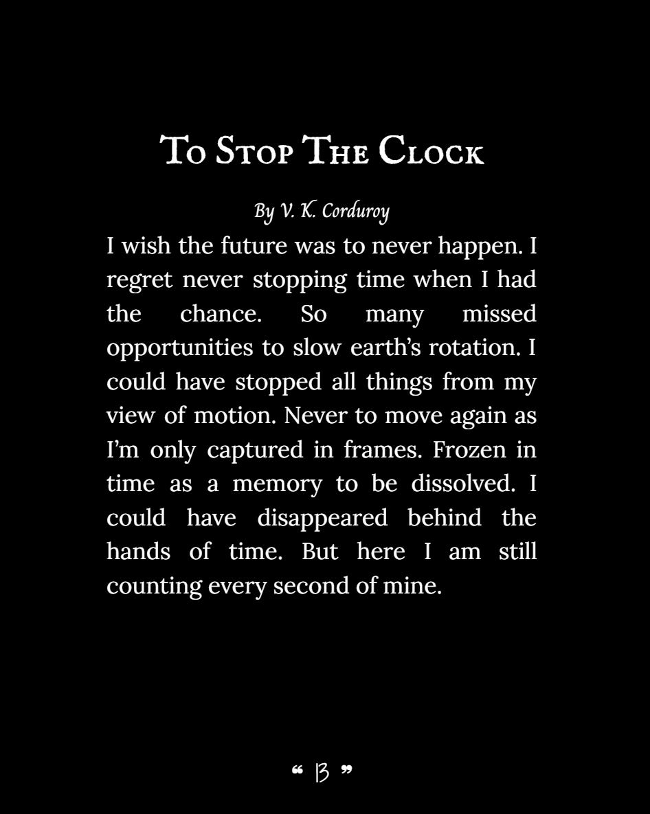 What an interesting perspective, regretting moving forward, rather than the usual urge to change a specific moment in the past (other than not stopping time when it still was possible).